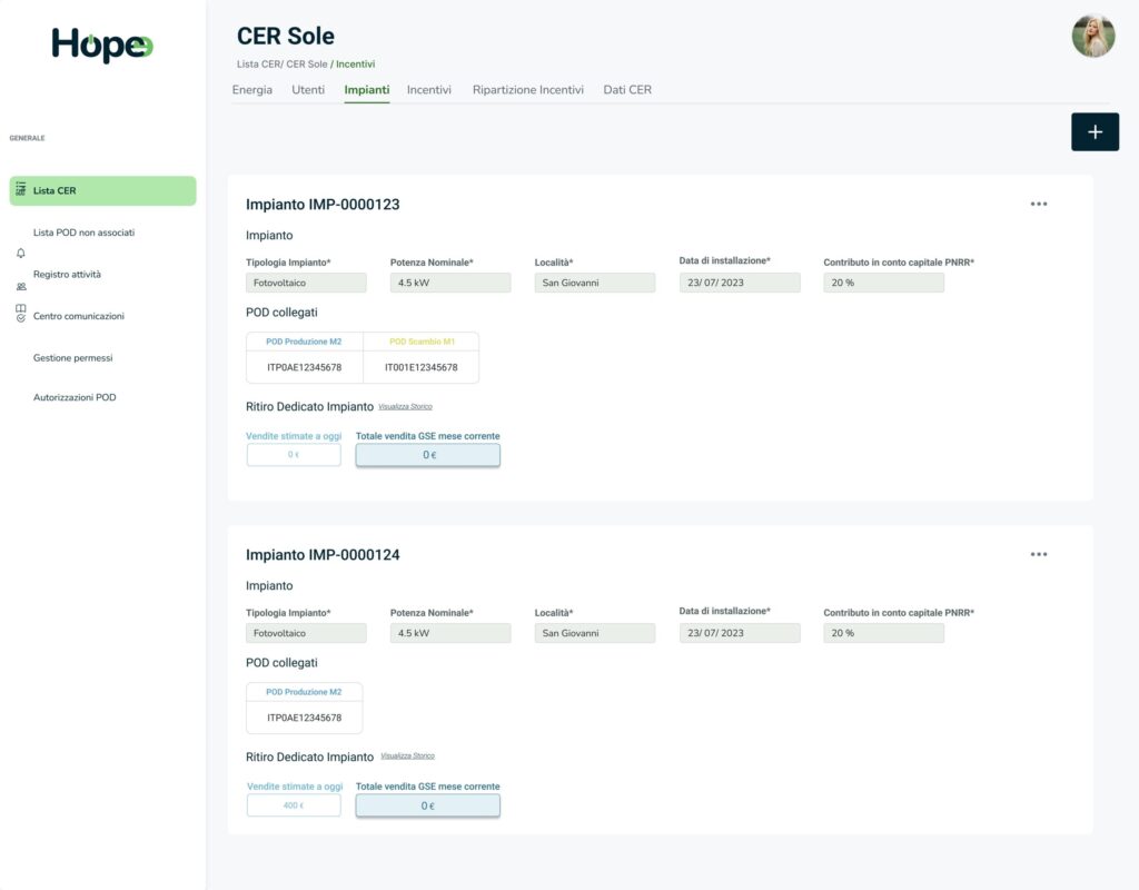 La sezione Impianti è centrale per la gestione tecnica della CER. Consente di mantenere un controllo puntuale sugli asset energetici della comunità, supportando attività di monitoraggio, rendicontazione e pianificazione strategica.